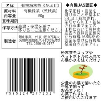 オーガニック粉末茶です。新茶を摘む前に黒色の遮光ネットで覆うことによって旨味・甘味が濃厚なまろやかな味わいと香りを実現しました。